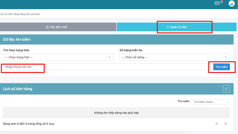 - Bước 5: Để kiểm tra lịch sử đơn hàng > Nhập link/id cần tìm > Nhấp tìm kiểm để kiểm tra đơn hàng.