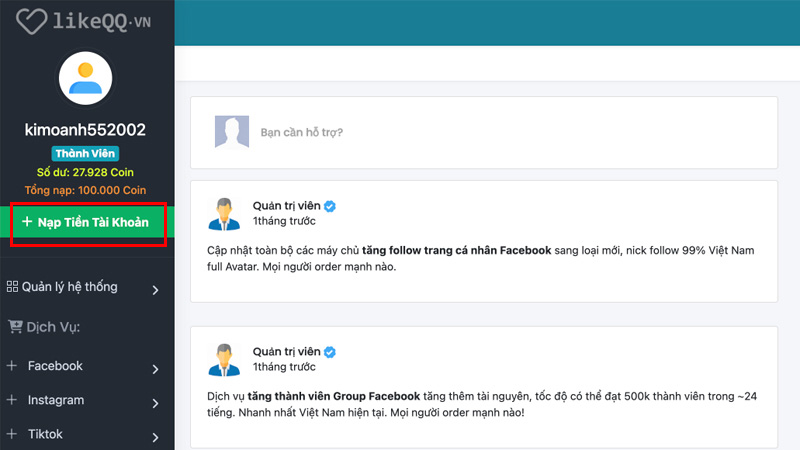- Bước 1: Đăng ký – Đăng nhập vào hệ thống tăng sub > Nạp tiền vào web để tiến hành tăng sub.