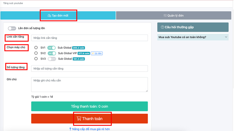 - Bước 3: Ngay phần Tạo đơn mới > Nhập link video cần tăng sub > Chọn máy chủ phù hợp với nhu cầu > Nhập số lượng sub cần tăng > Viết ghi chú (nếu có).