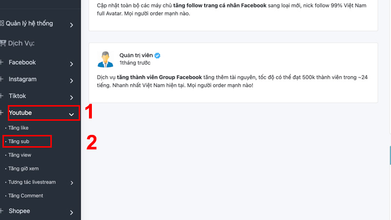 - Bước 2: Ở menu > Chọn dịch vụ YouTube > Chọn tiến hàng tăng sub.
