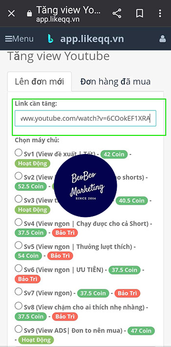 - Bước 5: Nhập “ link Youtube cần tăng”, chọn server phù hợp với nhu cầu.
