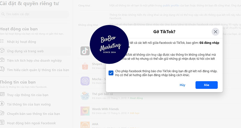 Cách hủy liên kết TikTok với Facebook nhanh nhất đã được BeoBeo Marketing hướng dẫn rất chi tiết qua điện thoại và máy tính. Bạn sợ những thông tin quan trọng mình bị lộ ra ngoài khi liên kết 2 tài khoản, bạn chỉ cần 30s để truy cập Facebook để xóa liên kết. Hy vọng bài viết cung cấp nhiều thông tin hữu ích cho bạn.