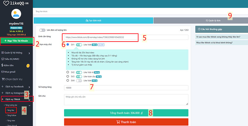 - Nhập link cần tăng, chọn sever máy chủ, nhập số lượng cần tăng, nhấp thanh toán.