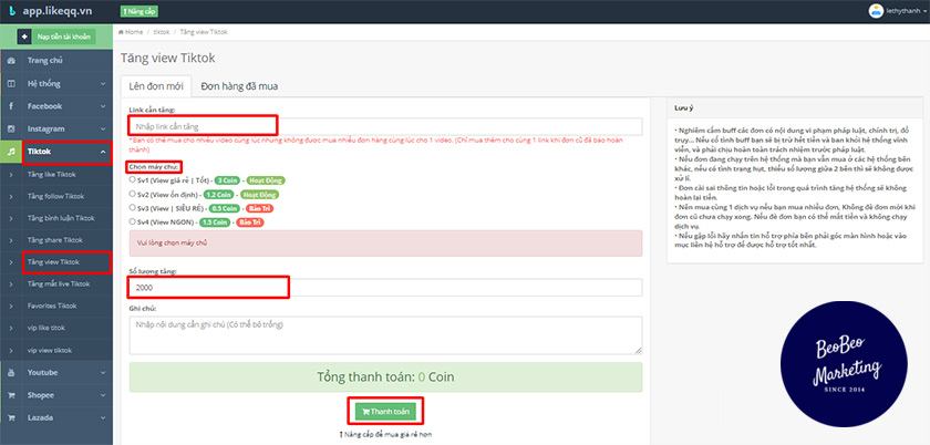 - Bước 4: Vào mục “TikTok” > Chọn “Tăng view TikTok” > Nhập link video cần tăng > Chọn máy chủ phù hợp > Nhập số lượng view muốn tăng > “Thanh toán”.