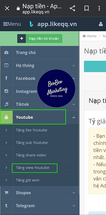 - Bước 4: Trở lại menu, chọn “ Youtube”, chọn “tăng view Youtube”.