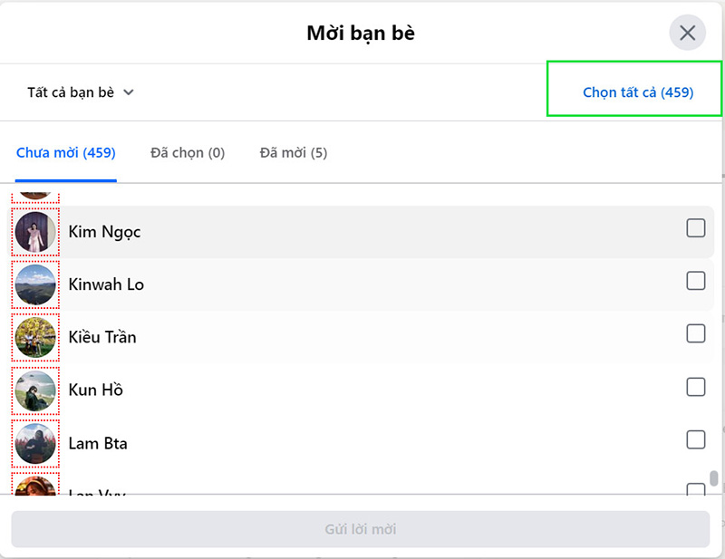 - Bước 2: Bấm vào Chọn tất cả. Tiếp chọn Gửi lời mời.
