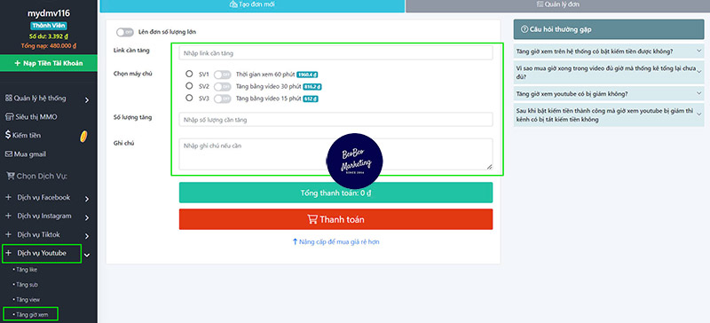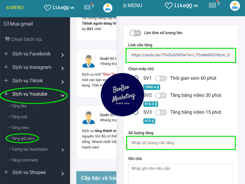 - Nhập link cần tăng, chọn máy chủ ( SV1, SV2, SV3), nhập số lượng cần tăng.