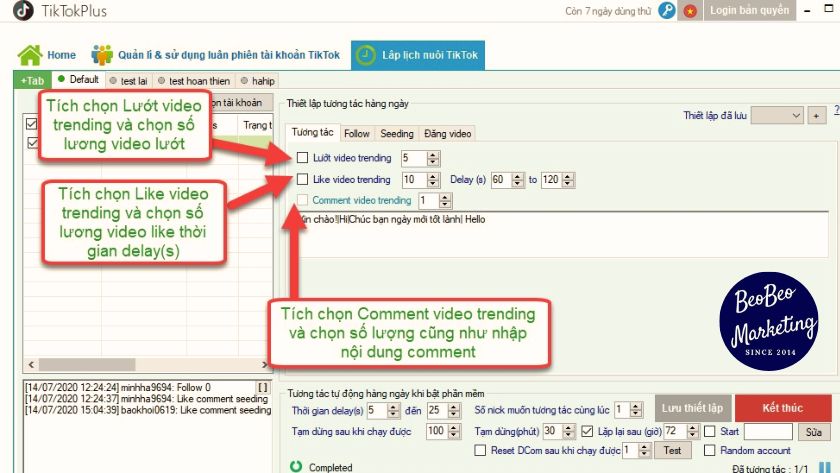 - Bước 2: Thiết lập chỉ số tương tác một cách cụ thể bằng cách chọn lướt video trending, số video bạn muốn lướt tương tác. Sau đó, tiếp tục chọn like video trending, chọn số video tương tác để like, nhớ kèm theo thao tác chọn thời gian delay. Nếu muốn chăm sóc thêm chỉ số bình luận, thì tiếp tục comment video trending và chọn số video tương tác bình luận tương ứng.