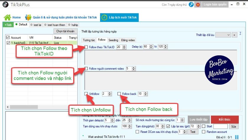- Bước 3: Tiếp đó, để thiết lập follow, cần căn cứ theo ID. Bạn chỉ cần chọn số lượng video tương tác theo dõi và chọn thời gian delay chúng. Kế tiếp, hãy theo dõi người comment video tương ứng với số lượng người theo dõi đã có comment video đó. Ngay sau đó, chọn thao tác unfollow để hủy theo dõi và follow back để theo dõi lại nếu muốn.