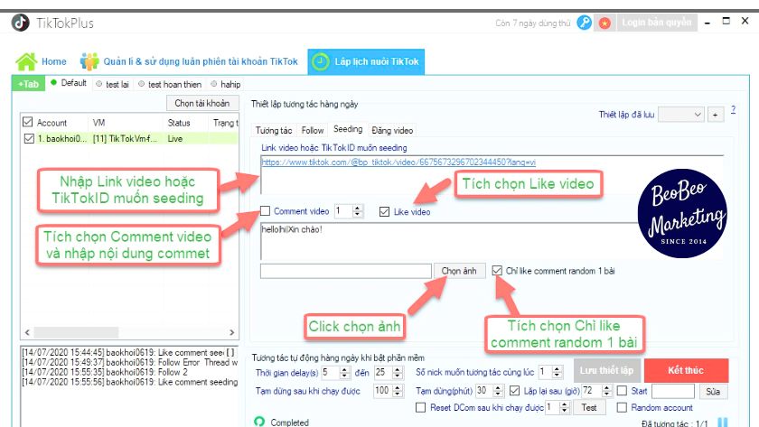 - Bước 4: Thiết lập “Seeding” bằng thao tác nhập đối với link video/ TikTok ID mà bạn muốn nuôi tài khoản Tiktok. Tiến hành comment video bằng cách nhập nhiều nội dung comment và ngăn cách chúng với nhau bởi dấu “|”. Lúc này, số lượng sẽ được random trong nội dung comment đã nhập đó để comment video như hình sau: