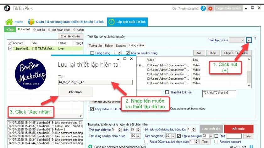 - Nhập một cái tên muốn lưu thiết lập ở các mục tương tác – theo dõi – seeding – đăng tải video tại phần trên.