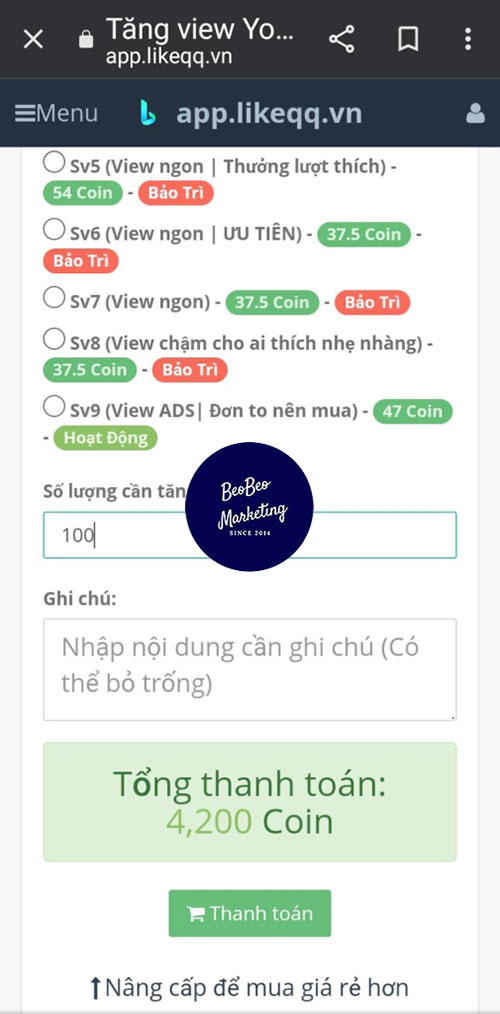 - Bước 6: Nhập số view youtube cần tăng, chọn thanh toán: coin.
