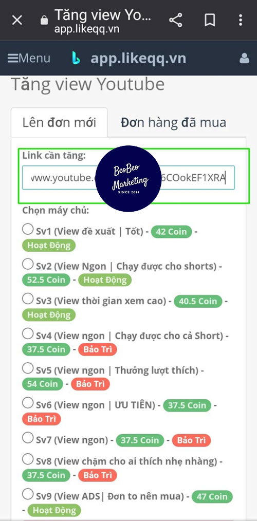 - Bước 5: Nhập “link Youtube cần tăng”, chọn server thích hợp.