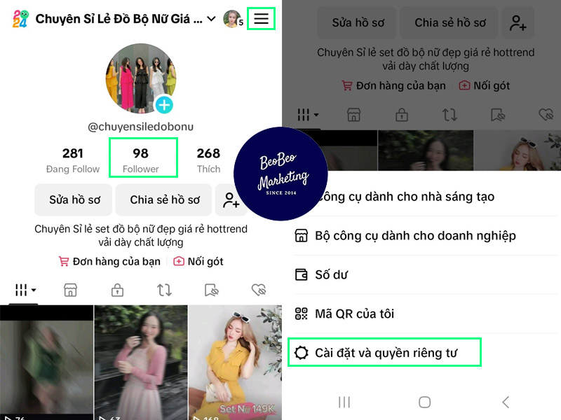 - Bước 1: Truy cập kênh TikTok, chọn biểu tượng “hồ sơ“, chọn dấu :”Ba gạch” bên phải.