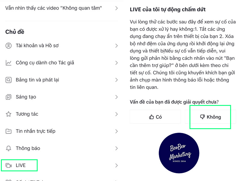- Bước 4: Tại mục:”Vấn đề bạn được giải quyết chưa?”, bạn chọn:”Chưa” để TikTok xử lý khó khăn bạn gặp phải trong quá trình livestream.