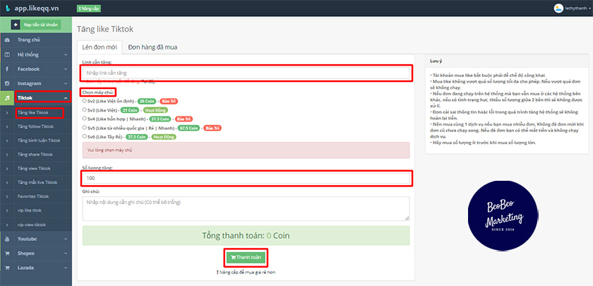 - Bước 4: Chọn mục “TikTok” > Chọn loại tương tác muốn tăng > Dán link cần tăng > Chọn Server (máy chủ) phù hợp > Nhập số lượng tương tác sẽ tăng > Chọn “Thanh toán” > Vào mục “Đơn hàng đã mua” để theo dõi tiến trình thực hiện.