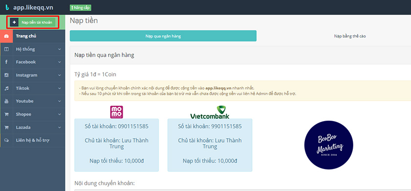- Bước 3: Nạp tiền vào hệ thống bằng Momo, tài khoản ngân hàng hoặc card điện thoại.