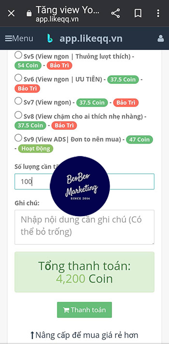 - Bước 6: Nhập số view youtube cần tăng, nhấn thanh toán: coin.